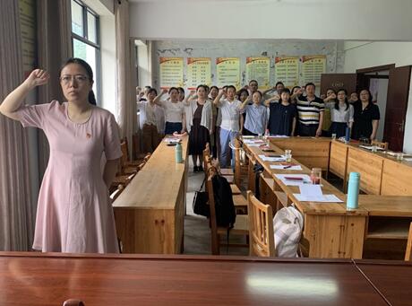初步交流之后,由马院党总支宣传委员李洁领誓,全体党员在党旗下郑重举起右拳,一起重温了入党誓词;驻村队员杨朝林领学了党章第七章“党的纪律”。