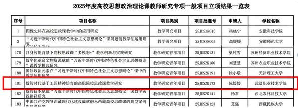 教育部人文社科研究项目是教育部面向我国普通高等学校设立的科研课题,在人文社科研究领域影响广泛,是衡量高校人文社科研究水平的重要标志。教育部高校思想政治理论课教师研究专项作为教育部人文社会科学研究项目之一,是“高校哲学社会科学繁荣计划专项”的重要组成部分,该项目聚焦支持一线思政课教师深化教学研究、促进理论实践融通,切实增强思政课的育人实效与感染力。今年,全国范围内仅立项198项,湖北省高校获批3项,我校为省内唯一入选的职业院校,标志着我校思政课改革取得高质量突破。