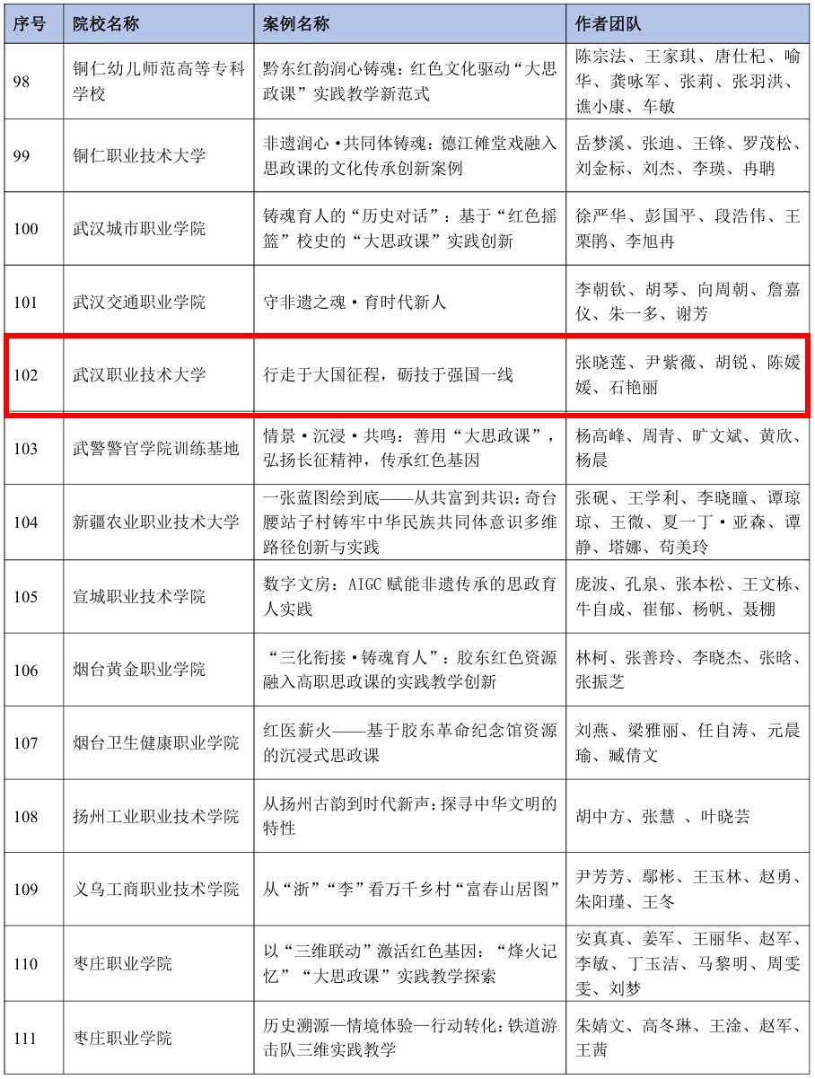 (通讯员:石艳丽)近日,由高等教育出版社和新华网联合开展的全国高校“大思政课”实践教学典型案例征集活动名单正式公布,武汉职业技术大学报送的实践教学案例《行走于大国征程,砺技于强国一线》成功入选全国典型案例。